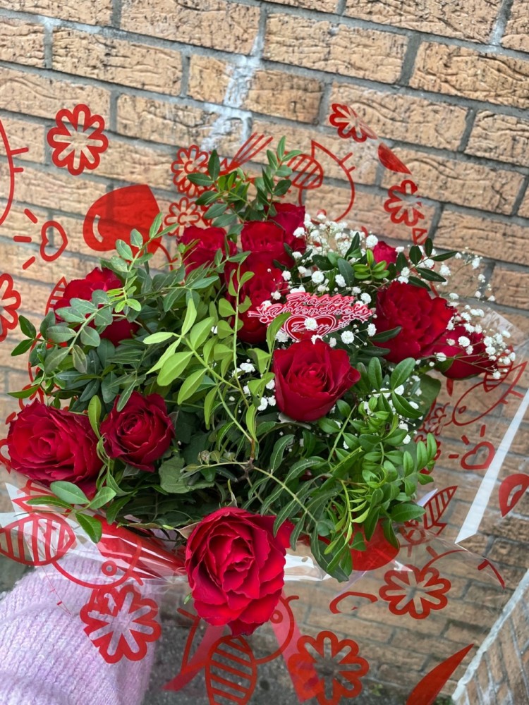Delight with a classic of a dozen red roses with February 14th. Our handtied bouquet comes with fresh seasonal foliage, gypsophila and pretty Valentine's packaging ready to pop straight into a vase.