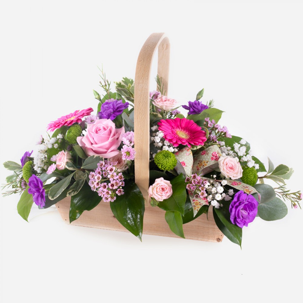 Such a sweet arrangement of flowers presented in a trug basket. Examples of flowers that may be included are roses, germini, carnations and chrysanthemum.