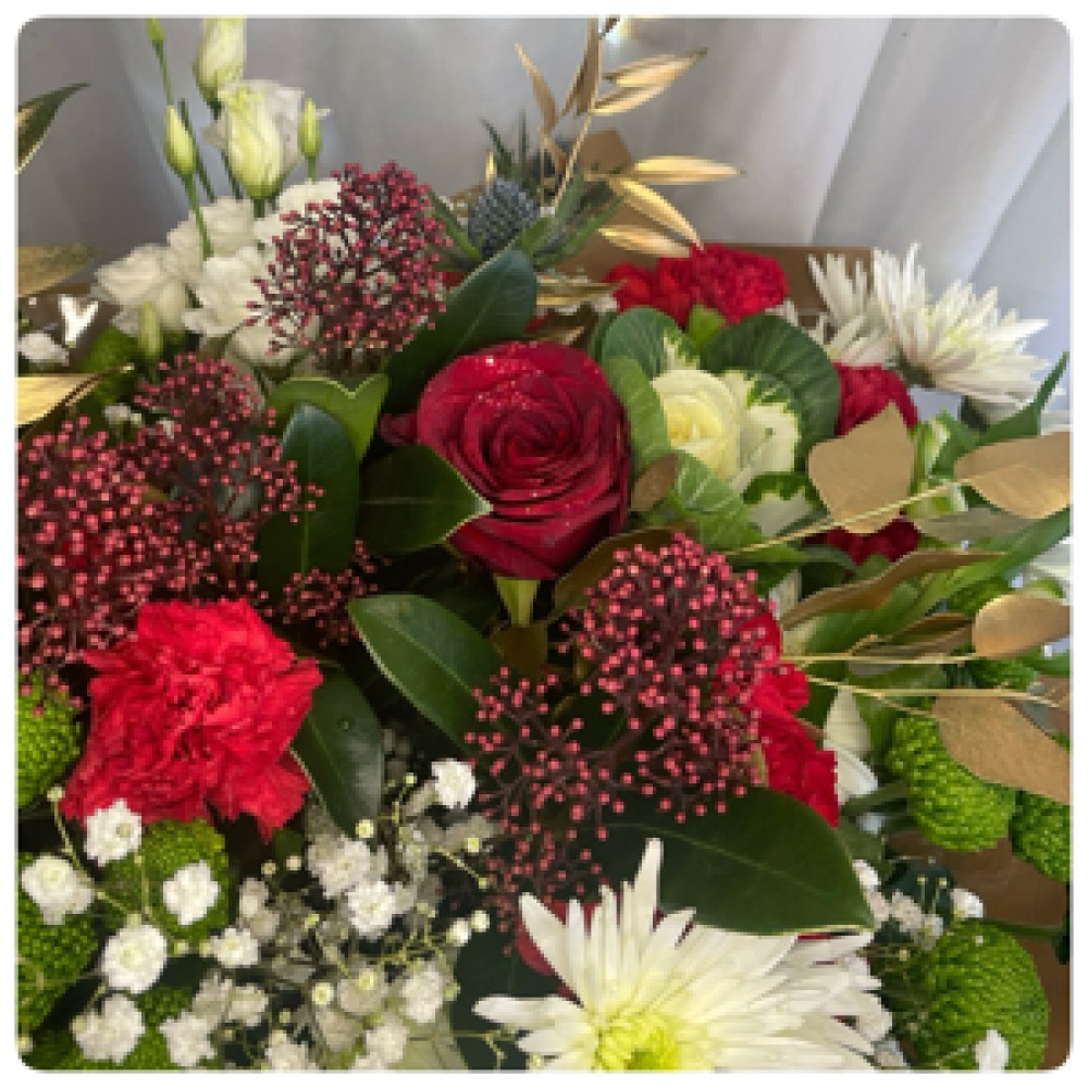 An opulent display of fresh flowers in rich and vibrant tones with flashes of golden foliage mean this bouquet is sure to impress.